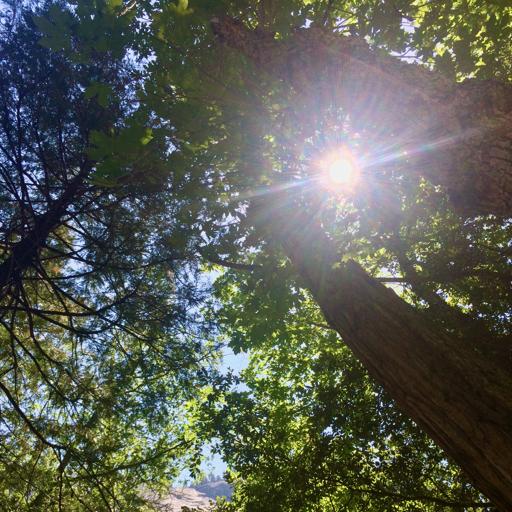 View Sun through trees on Mirror Lake TrailNorth Dome and Half Dome from Curry Village