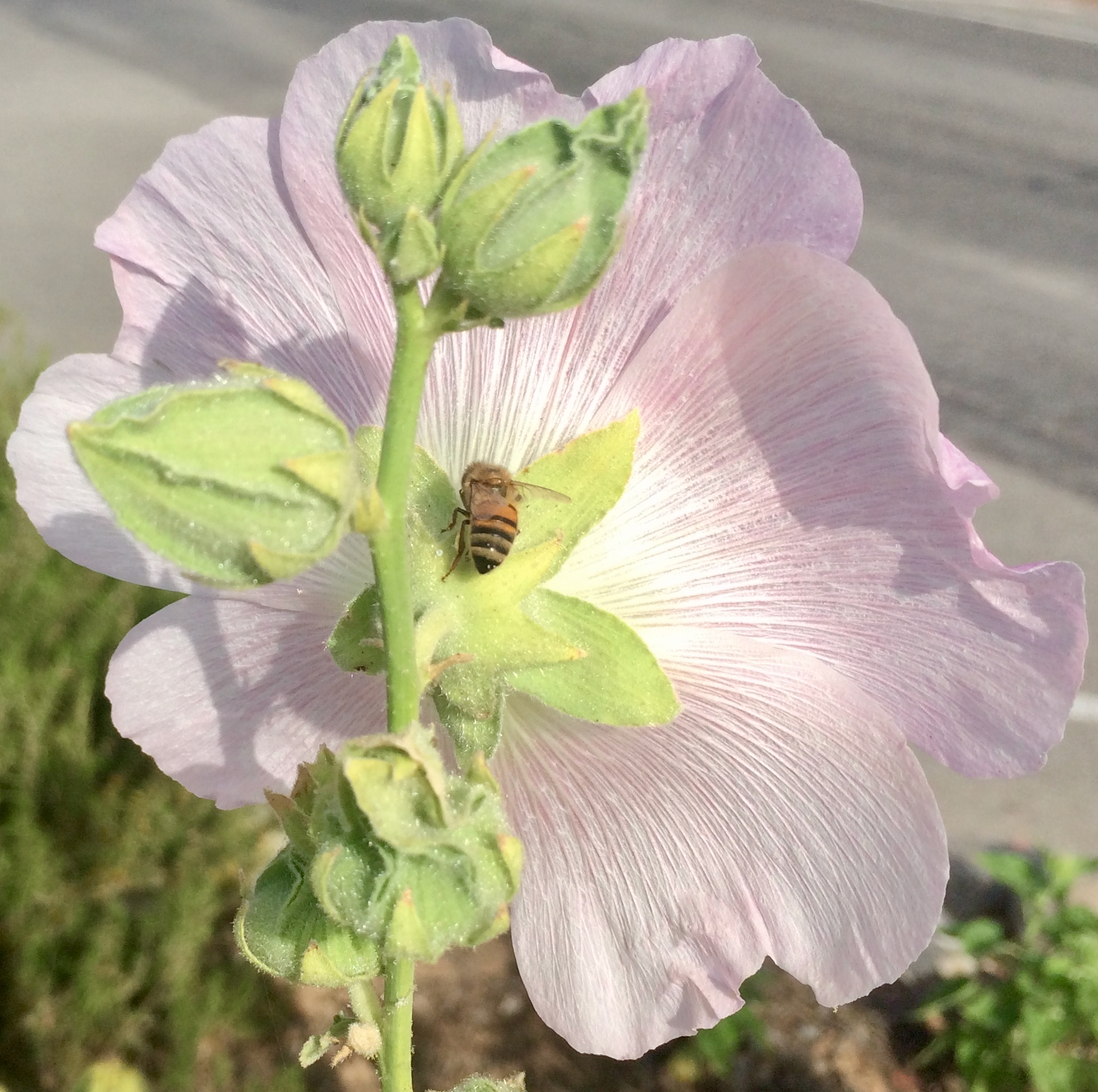 View Morning glories on Thomas Aquinas TrailBee on hollyhock in Oak View