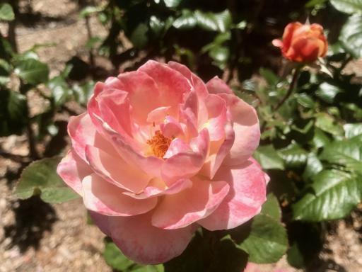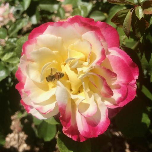 View Bee on a white and pink rose at KrotonaDewy wild rose leaves at Ojai Meadows