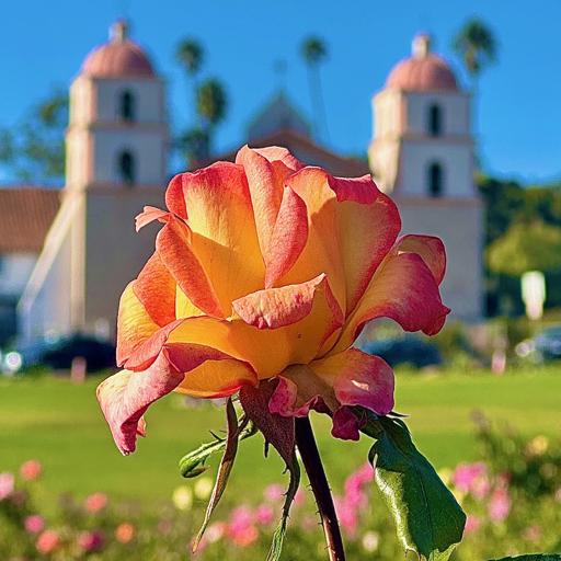 View Rose before Mission Santa BarbaraDewy Pink Rose at Mission Rose Garden